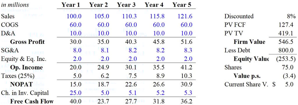 At its core, the concept rests on the balance sheet equation: Assets = Liabilities + Shareholders’ Equity. As equity is removed, creditors are effectively “trimmed” as well, so that the liabilities and equity side aligns with the assets side. For those more advanced, this rebalancing is not based on the book values on the balance sheet but rather on the present value of free cash flows and the present value of interest-bearing liabilities, with adjustments made according to the company’s debt capacity. For now, however, this serves only as an overview of why and how distressed debt situations arise.