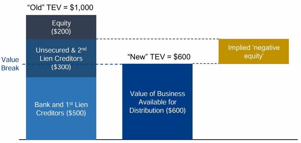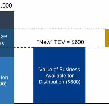 From a distressed debt investor’s perspective, this stage is all about expectations. Attention typically centers on the unsecured bonds, which represent the real “pain point” in the capital structure. This tranche, along with the secured bonds that are partially impaired, will likely form the voting classes on any plan of reorganization, since non-impaired classes do not vote. An investor might believe the company’s true value is closer to 700, which would push unsecured recoveries higher, making that tranche more attractive than the secured bonds, whose upside is capped by their smaller deficiency. To illustrate, imagine a 200 range between the collateral break (red line) and the value break (blue line). If the company is currently valued at around 550—rounded for simplicity from our earlier PV—but we believe TEV could reach 700 due to undervalued assets, a stronger market, or new buyers, then the 100 of potential recovery expands to 150. That implies a 150 percent increase in recovery prospects for the unsecured bonds and the unsecured portion of the second lien bonds.