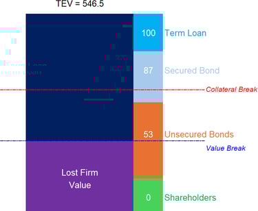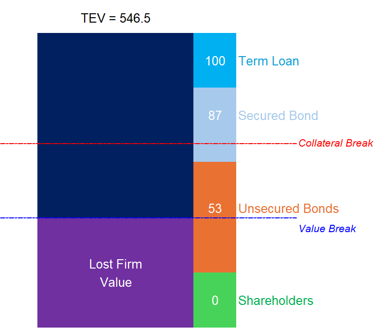 What we see here is essentially the combination of total enterprise value with the claims of each creditor class. The term loan is recovered in full, so we can assume a 100 percent recovery there. The secured bond, however, will only recover part of its claim from the collateral, with the remainder spilling into the unsecured pool to share recovery alongside the unsecured bonds, since the collateral break will not fully cover them. In this sense, both the secured and unsecured bonds are really pricing the uncertainty of that “value break” line. If the break falls between the orange and green points on the capital structure, then secured bonds would be almost certain of full recovery, aligning their pricing much closer to par. Still, bankruptcy outcomes are rarely straightforward, and recovery levels can take years to resolve. Unsecured bonds, priced at 53, are signaling expectations slightly above half recovery. At the same time, creditors may be factoring in the possibility that the value break shifts upward, with total enterprise value rising from undervalued assets or other adjustments, giving them more than what the current market suggests.
